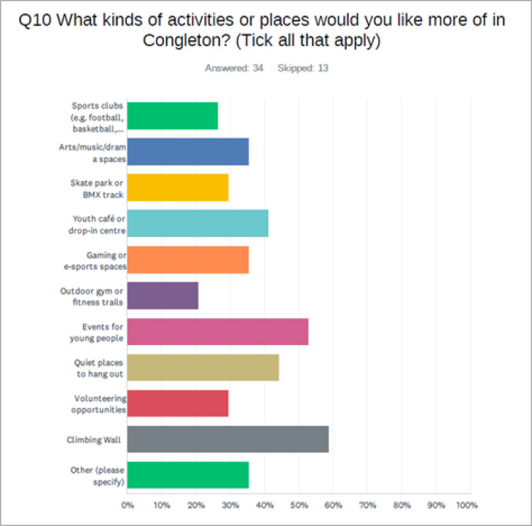 Top requests from the survey included a climbing wall, places to hang out, a youth café and events for young people.
