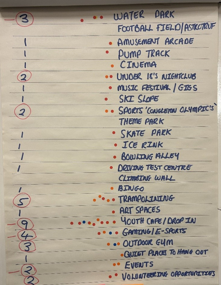 The group then got the opportunity to vote on their favourite ideas from the survey and the brainstorms, and work the most popular ones up into more complete plans for a Youth Council to take forward.