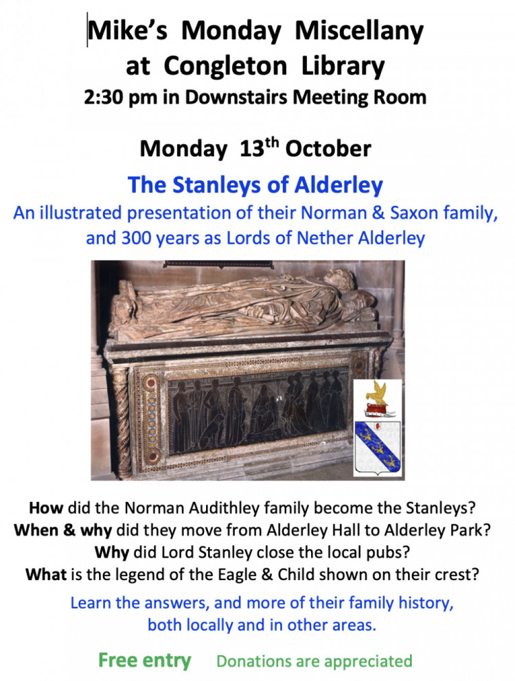 Looking ahead to next week, Congleton Library will play host to an illustrated presentation on the Stanleys of Alderley.