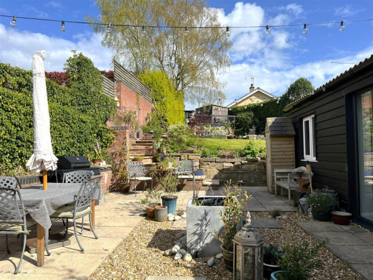 A paved and decorative stone patio sits at the base, perfect for outdoor seating, with steps leading up to a lawned area and further seating space ideal for summer evenings, entertaining or family time.